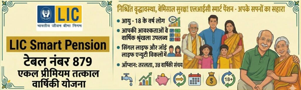 एलआईसी ने स्मार्ट पेंशन प्लान टेबल नंबर 879 अच्छा प्लान लॉन्च किया है जिसको आप अगर लेते हैं तो तुरंत आपको पेंशन मिलना शुरू हो जाती है यह एक गैर-पार, गैर-लिंक्ड, व्यक्तिगत, बचत, तत्काल वार्षिकी योजना हैं और ज़िंदगी भर जो कि स्मार्ट लोगों की पसंद और स्मार्ट लोगों के लिए है इस प्लान को LIC ने 18 फ़रवरी 2025 को लॉन्च किया था |